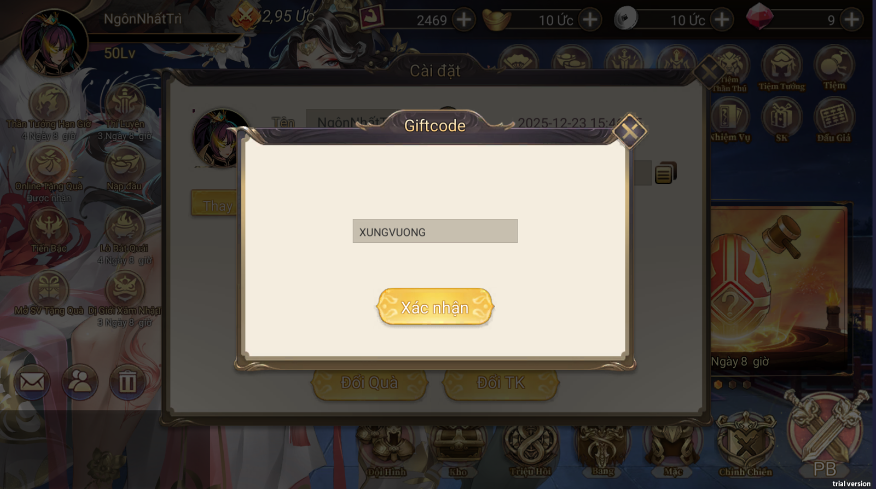 Nhập code vào ô và bấm Xác Nhận là thành công.