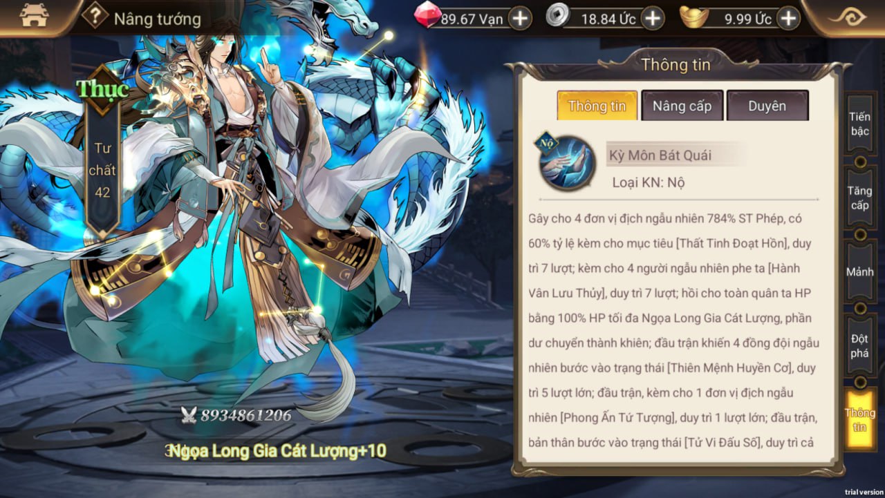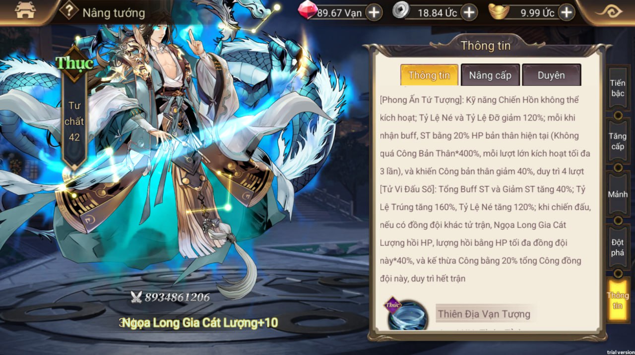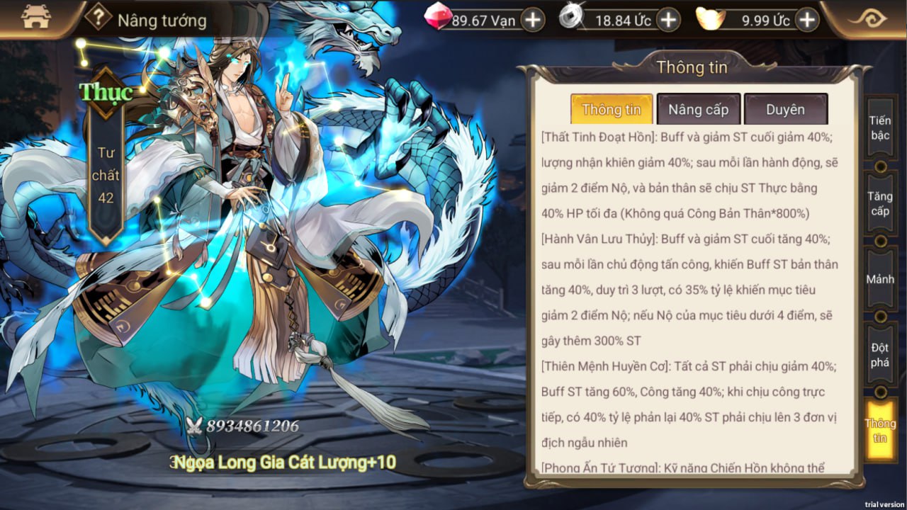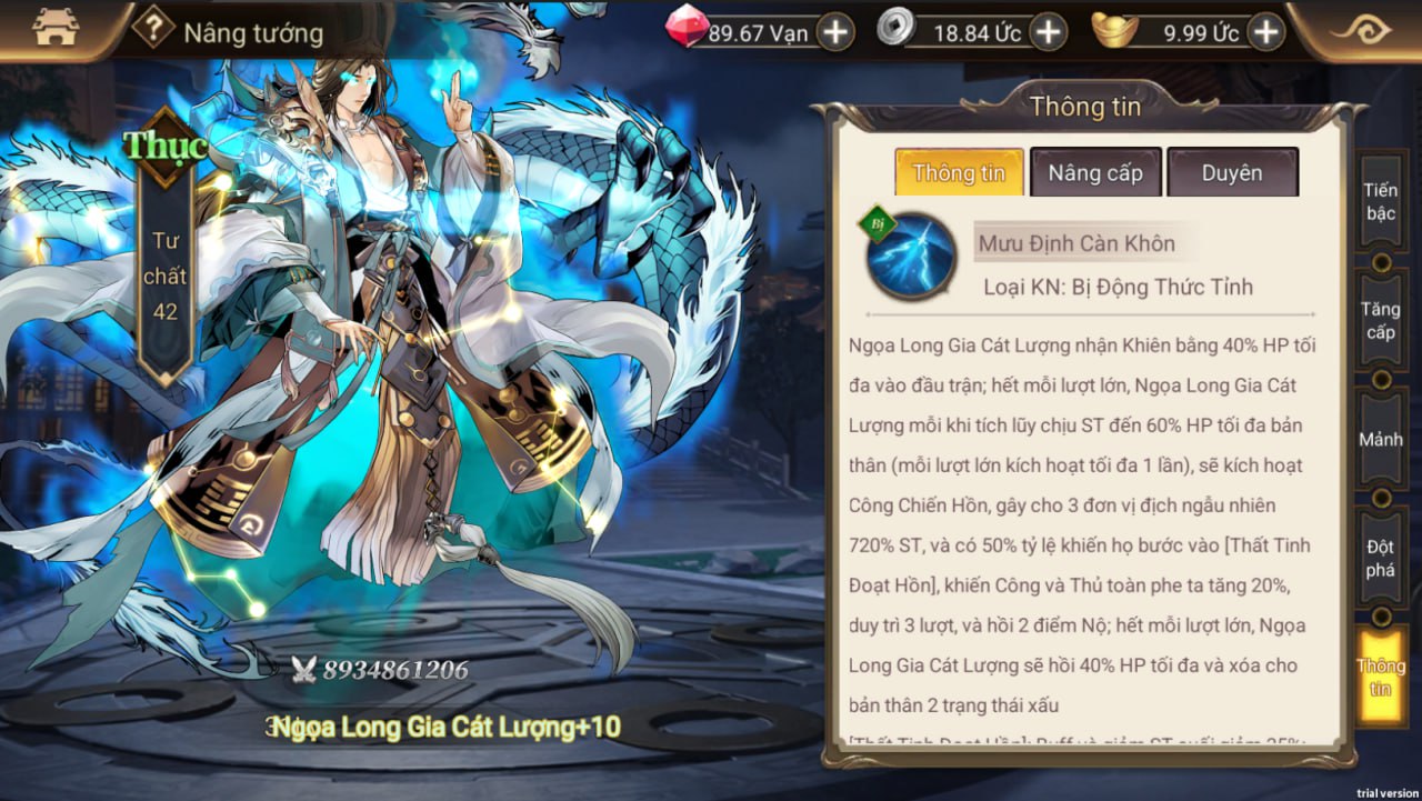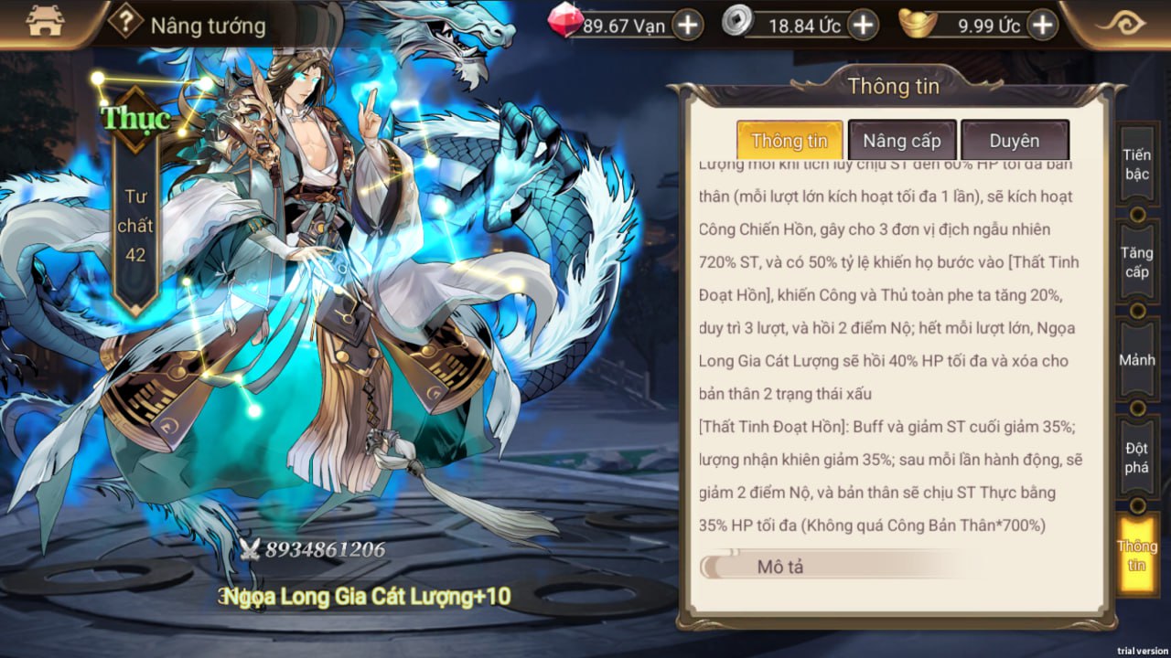 - Tăng % buff, giảm sát thương cuối của phe ta, gây thêm sát thương cho địch dưới 4 điểm nộ. Có tỉ lệ phản thương lên 3 đơn vị địch;