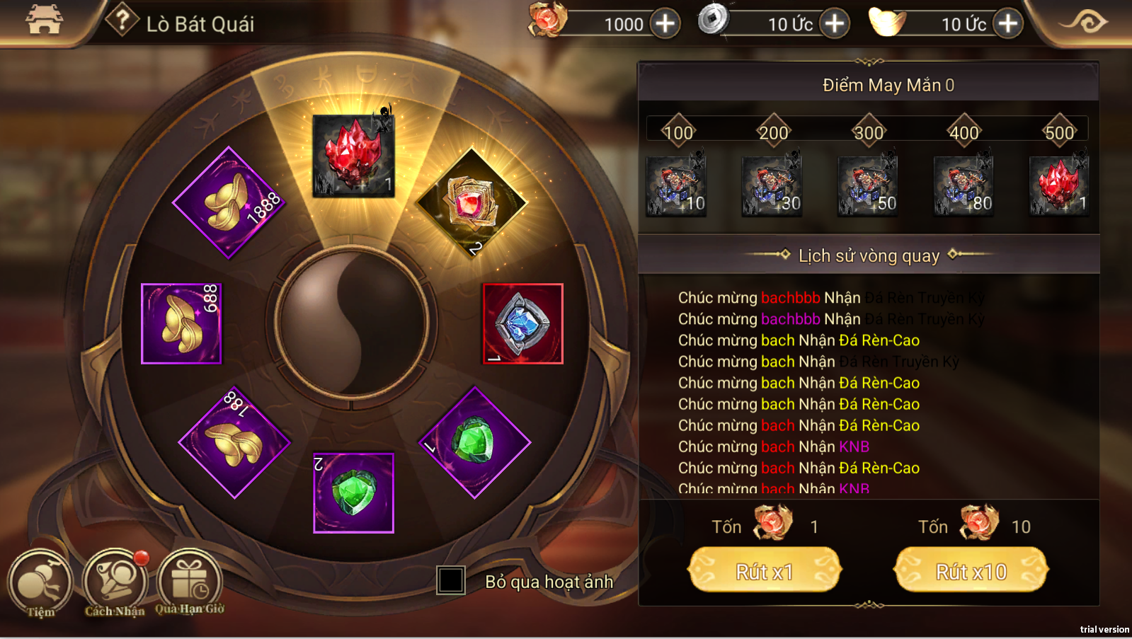 - Đây là vòng quay có thể kiếm trang bị hắc kim, dùng Đá Bát Quái để tham gia sự kiện.