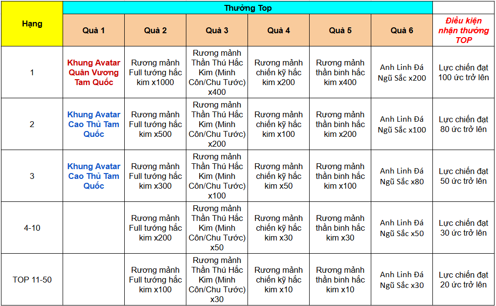 - Trong thời gian diễn ra sự kiện, Chủ Soái tăng lực chiến đạt hạng và mốc điều kiện nhận thưởng tối thiểu để nhận thưởng TOP;