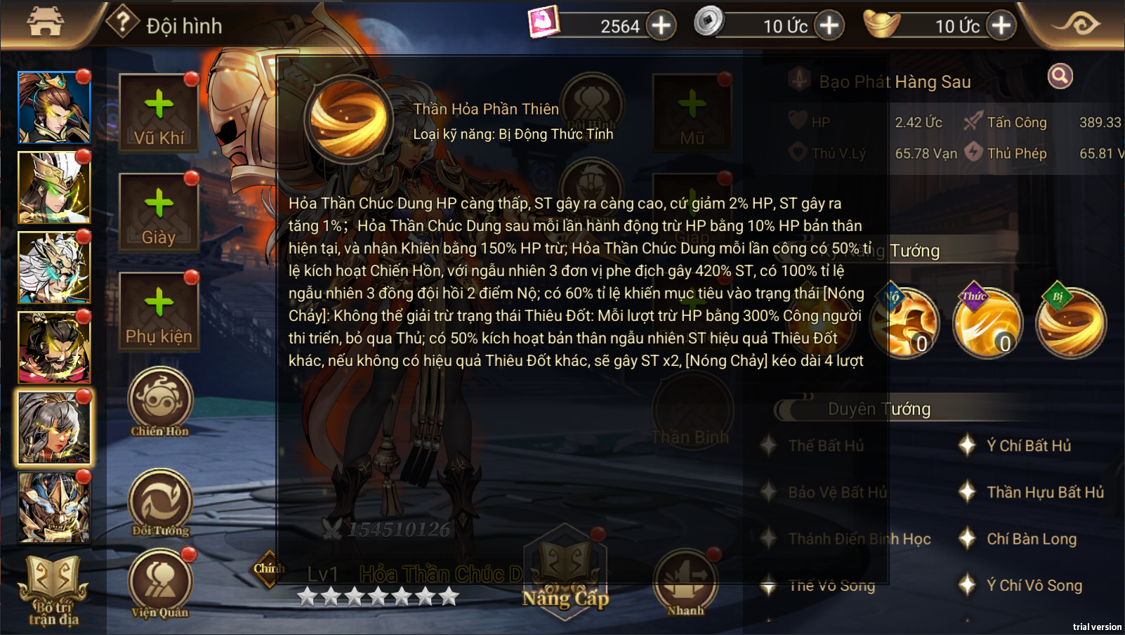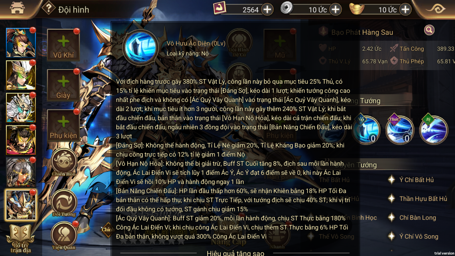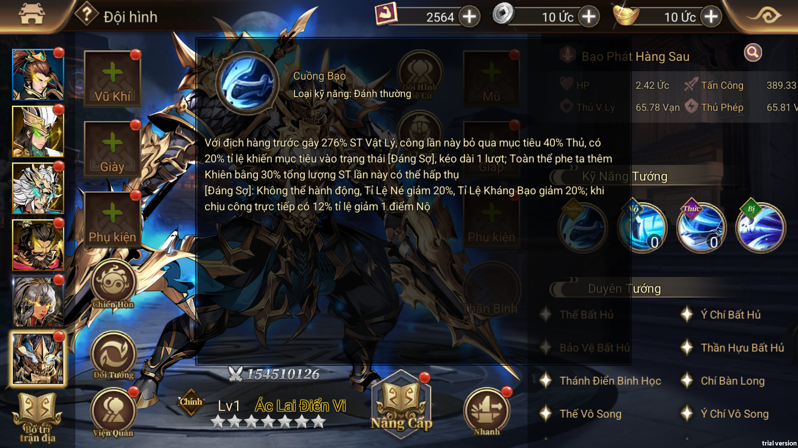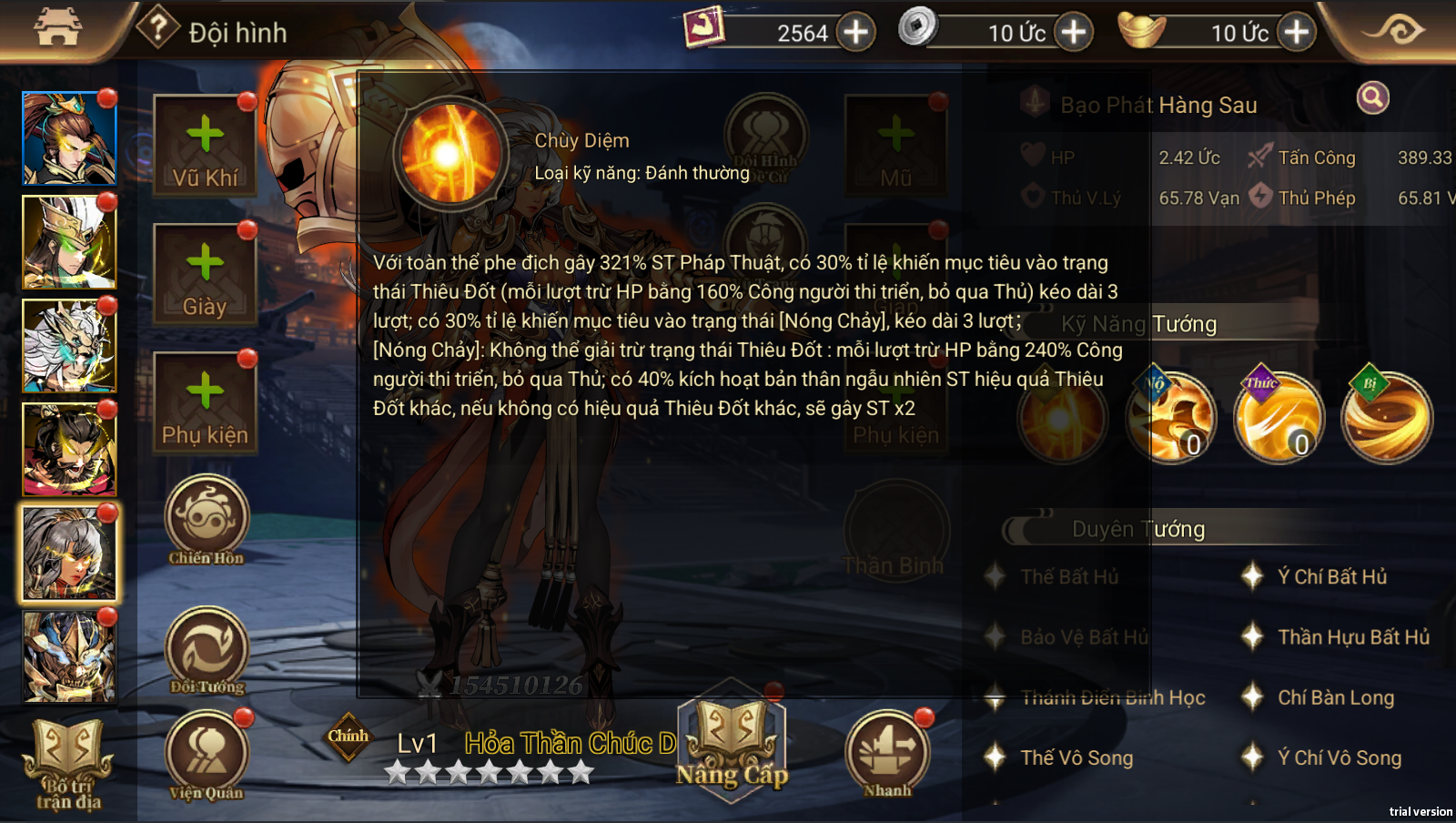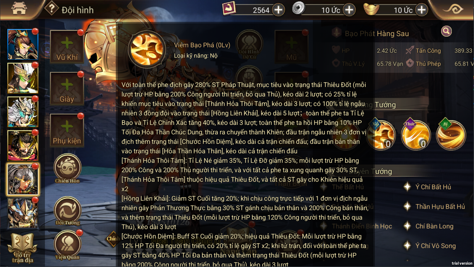 - Kỹ năng tổng thể: Bạo phát hàng sau, Thiêu Đốt địch, Tấn công nhóm