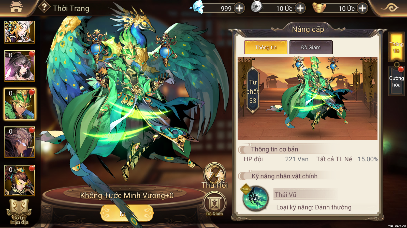 Thông tin Kỹ năng chi tiết của Trang phục Hắc Kim - Khổng Tước Minh Vương Chủ Soái có thể vào mục Mặc -> Thời Trang trong game để xem thêm chi tiết.